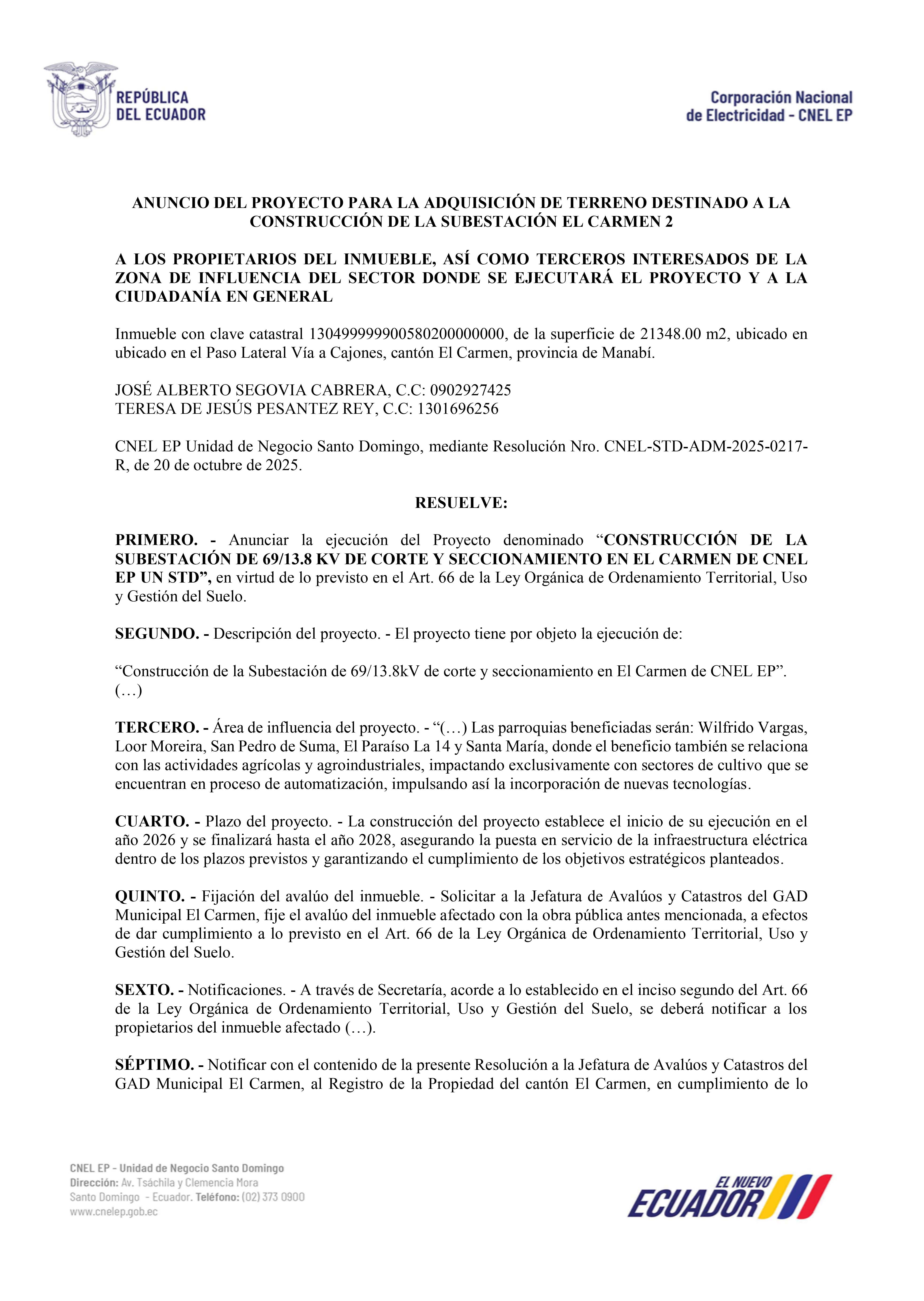 ANUNCIO DEL PROYECTO PARA LA ADQUISICIÓN DE TERRENO DESTINADO A LA CONSTRUCCIÓN DE LA SUBESTACIÓN EL CARMEN 2