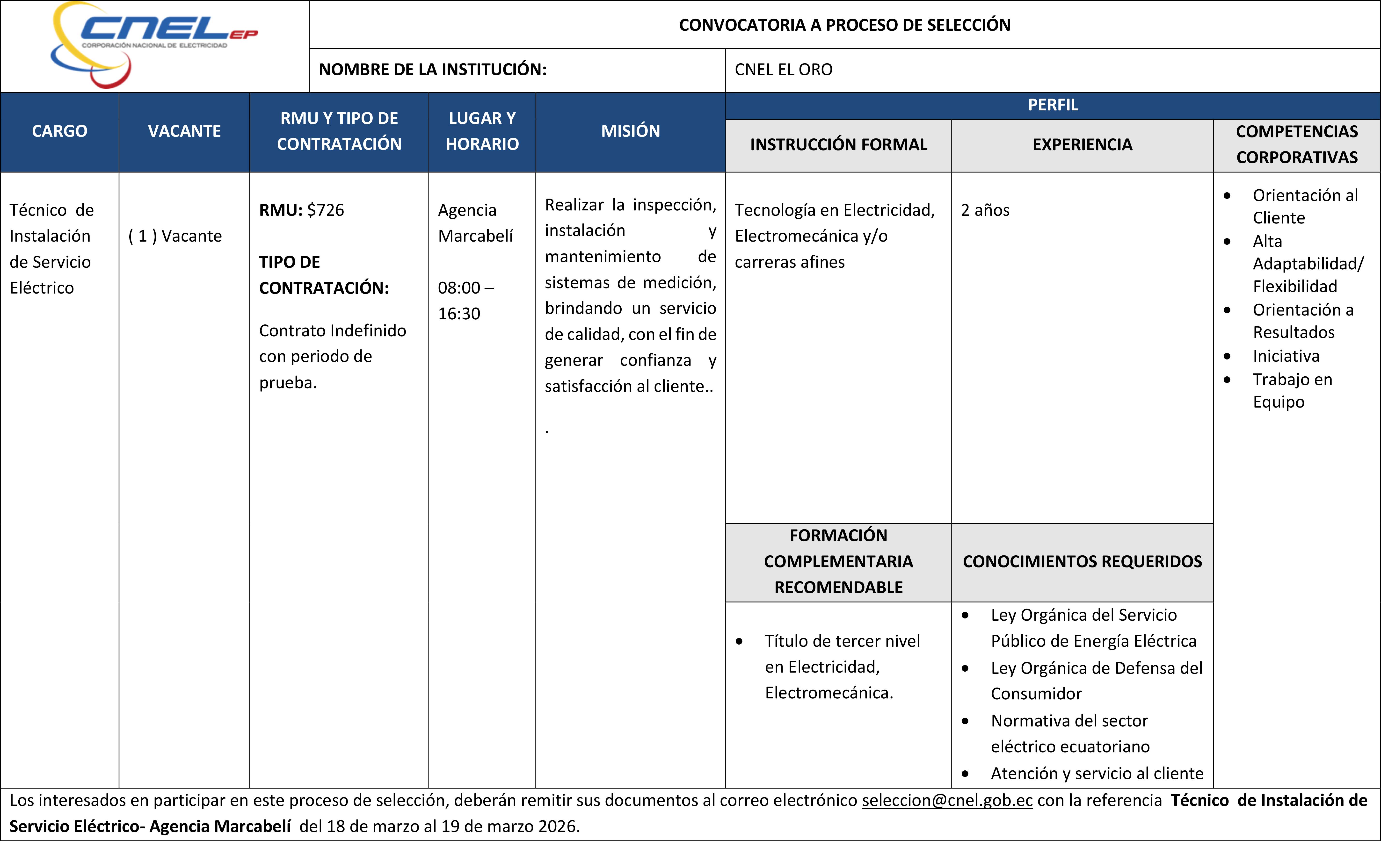 CNEL EP – CONVOCATORIA DE TÉCNICO DE INSTALACIÓN DE SERVICIO ELÉCTRICO – MARCABELÍ
