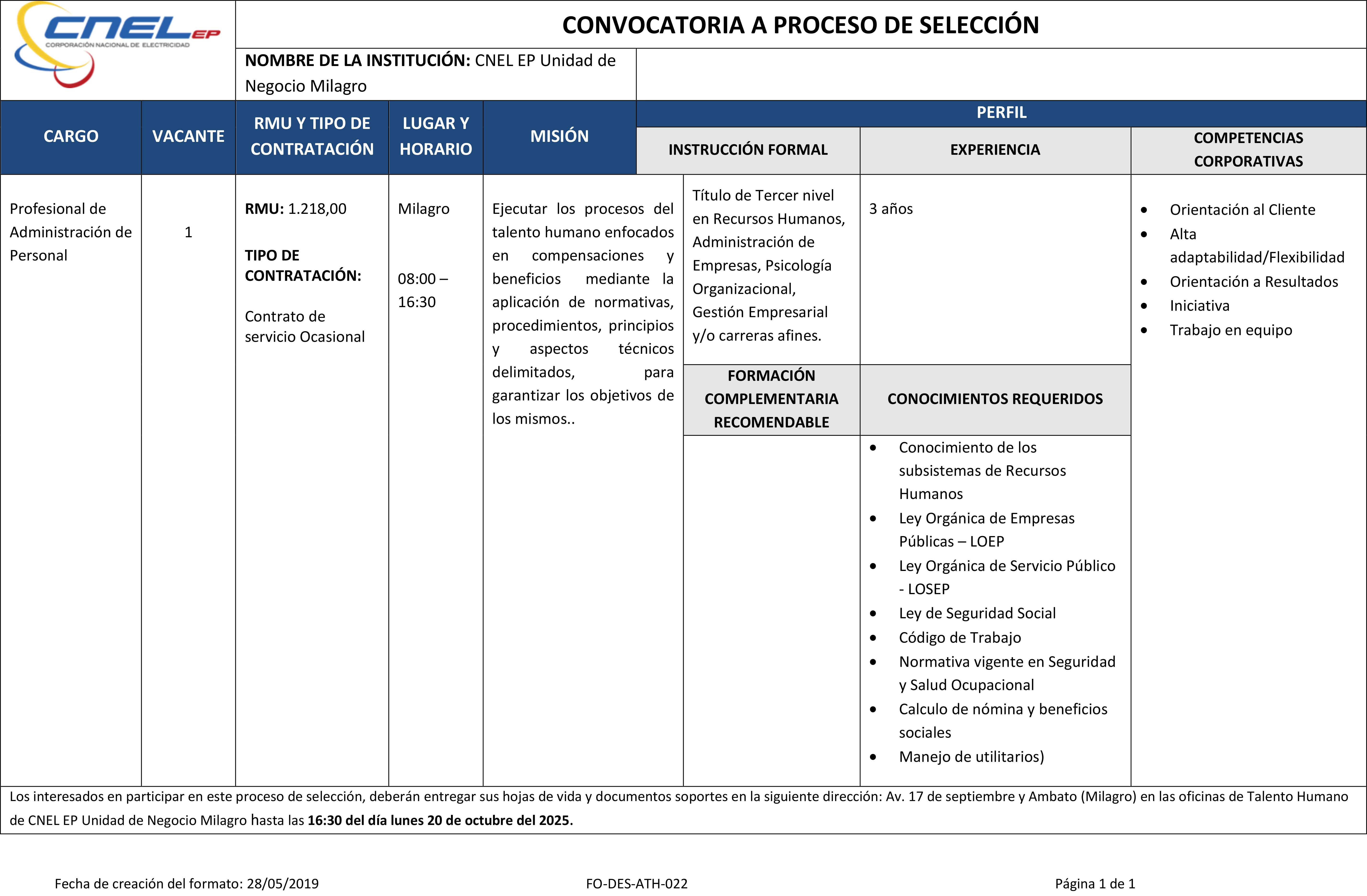 CNEL EP UN DE NEGOCIO MILAGRO – CONVOCATORIA CONTRATACION DE (1) PROFESIONAL DE ADMINISTRACIÓN DE PERSONAL