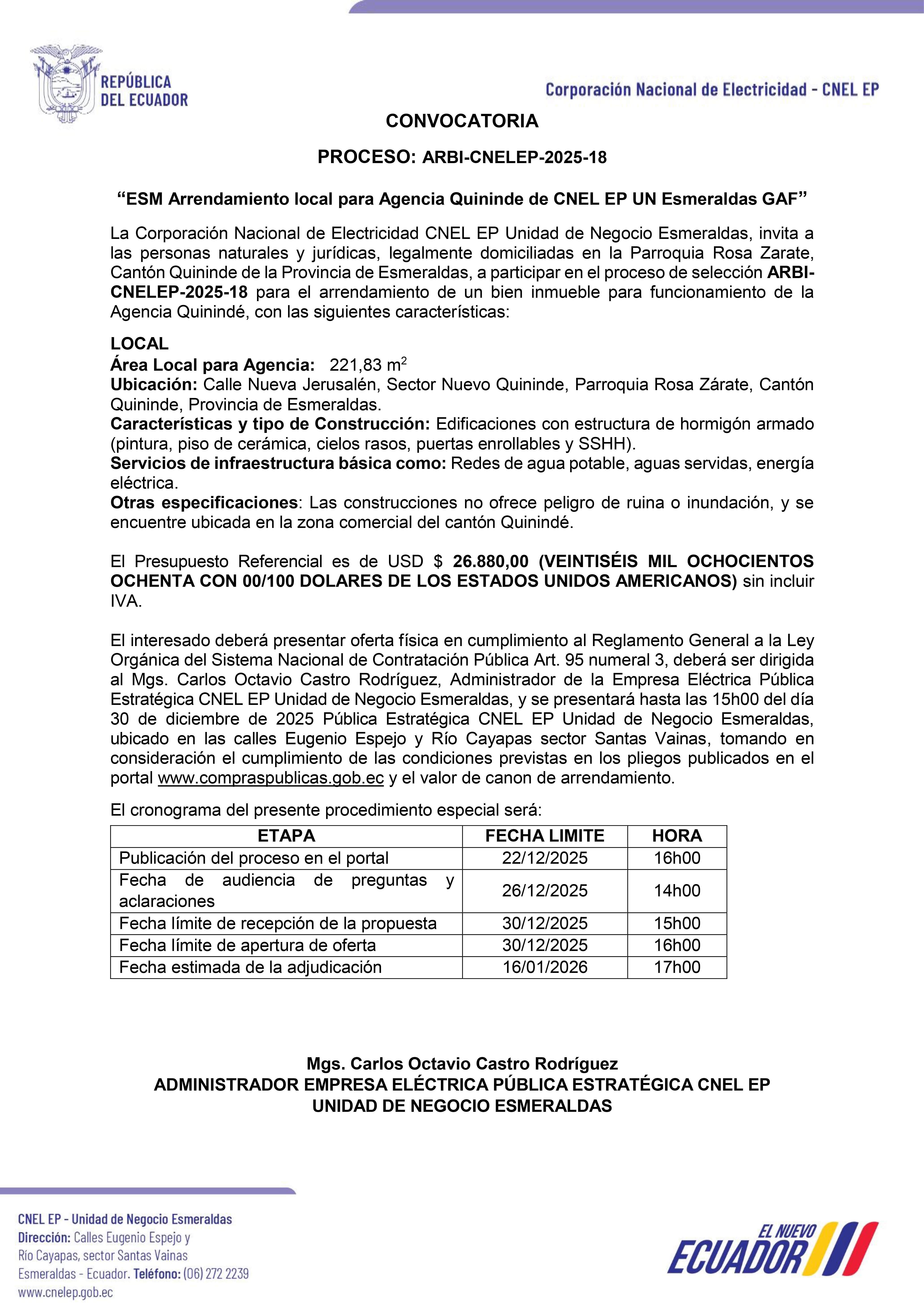 CNEL EP UN Esmeraldas PROCESO: ARBI-CNELEP-2025-18 “ESM Arrendamiento local para Agencia Quinindé de CNEL EP UN Esmeraldas GAF”