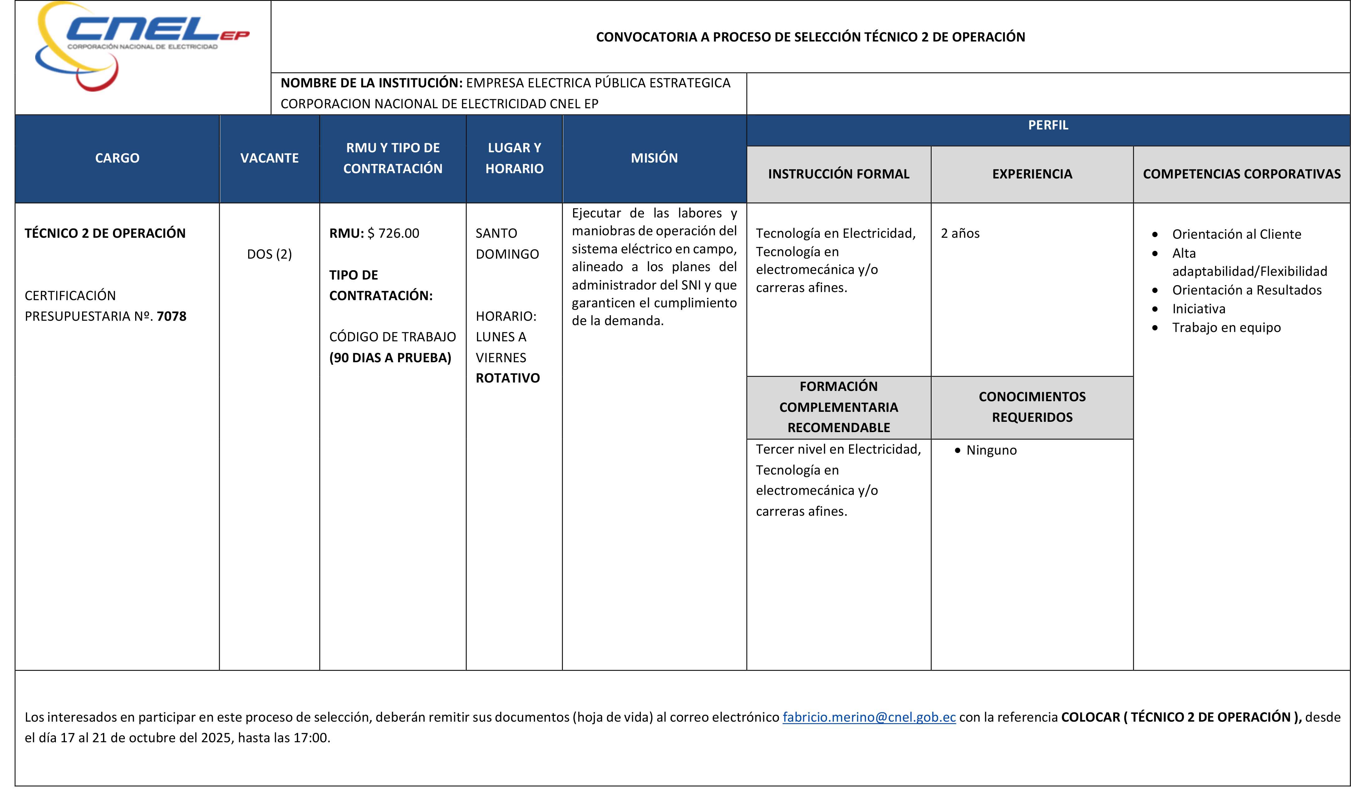 https://www.cnelep.gob.ec/wp-content/uploads/2019/03/header_Logo.png00Carlos Xavier Valero Ochoahttps://www.cnelep.gob.ec/wp-content/uploads/2019/03/header_Logo.pngCarlos Xavier Valero Ochoa2025-10-17 17:38:362025-10-17 17:38:36CNEL EP UN SANTO DOMINGO CONVOCATORIA A PROCESO DE SELECCIÓN DE DOS (2) TÉCNICOS 2 DE OPERACIÓN