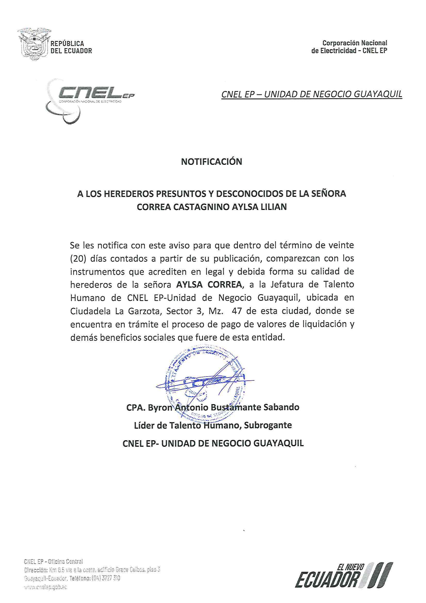 UNIDAD DE NEGOCIO GUAYAQUIL PROCESO POST MORTEM – CORREA CASTAGNINO AYLSA LILIAN